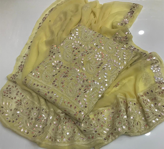 One of the most demanded designs, crafted in premium Bember chiffon with intricate hand-chikankari and press gota work. This outfit carries a stunning full-jaal shirt paired with a beautifully finished dupatta, making it a standout traditional piece.