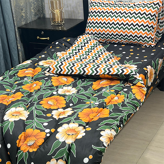 Single Bed Comforter Set – 3 Pieces – Orange & Black Floral