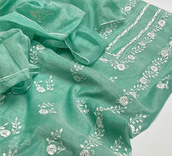 A beautifully designed traditional suit crafted in soft paper cotton. The pakka tarkashi embroidery detailing on the neckline, kaliyan, and motifs make this outfit perfect for festive wear and everyday elegance.